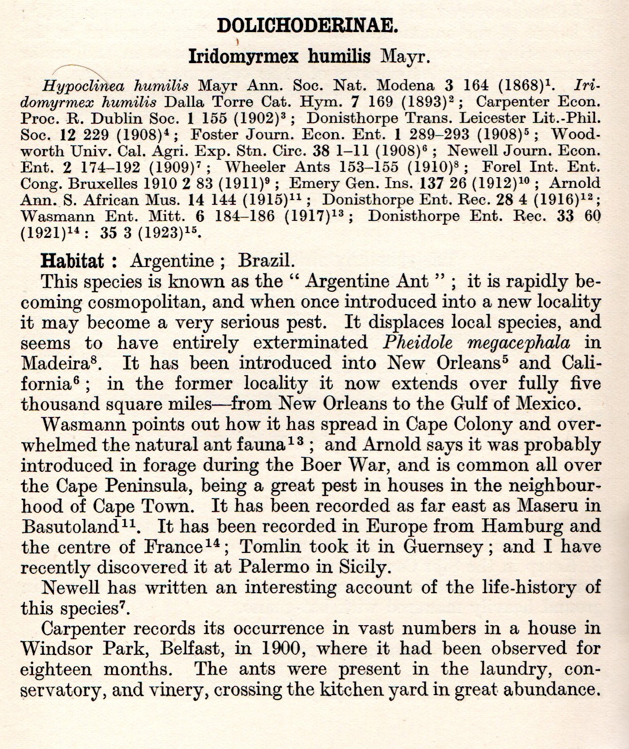 C'est une fourmi qui forme des supercolonies en Argentine, elle est polydomique, très polygyne et les ouvrières sont totalement stériles. Elle est arrivée du sud du Brésil en 1905 (et pas d’Argentine) sur la Côte d’Azur avec des plantes et s’est installée depuis avec succès. Elle reste cantonnée le long des côtes car elle ne supporte pas le gel. Elle s'est implantée dans le Languedoc-Roussilon dans les stations balnéaires avec des plantes importées de la Côte d'Azur (voir Passera 2006). On a décrit deux super-colonies, la première en Europe le long de la côte méditerranéenne et jusqu’en atlantique au Portugal (6 000 km de côte) avec une deuxième enclavée essentiellement en Catalogne (Giraud et al. 2002 - Voir Giraud). Cette deuxième super-colonie dispute "una batalla épica entre hormigas: las catallanas contra el resto de Europa" (Berazaluca 2016). Selon Sara Castro, doctorante de Donana, aux Baléares on trouve les deux super-colonies (Romero 2016). En fait une nouvelle super-colonie a été identifiée en Corse où j'ai observé ces fourmis à Calvi dans les années 70 (peut-être importée par les légionnaires ?) et au port des Oursinières dans une petite pinède à l'Est de Toulon (Blight et al. 2010). La supercolonie méditéranéeene est plus agressive, plus exploratrice de nouveaux environnements et efficace à exploiter des ressources alimentaires par rapport aux autres supercolonies introduites et aux natives en Argentine (Blight et al 2016). La seule différence entre les colonies natives d'Argentine et les introduites est la taille des supercolonies et leur longévité. Il y a aussi chez les introduites une exécution de 90% des reines au printemps, en mai, ce qui est exceptionnel chez les fourmis (Keller et al 1989) et une exécution des larves mâles (Passera et Aron 1996, voir Le Journal du CNRS 1997).