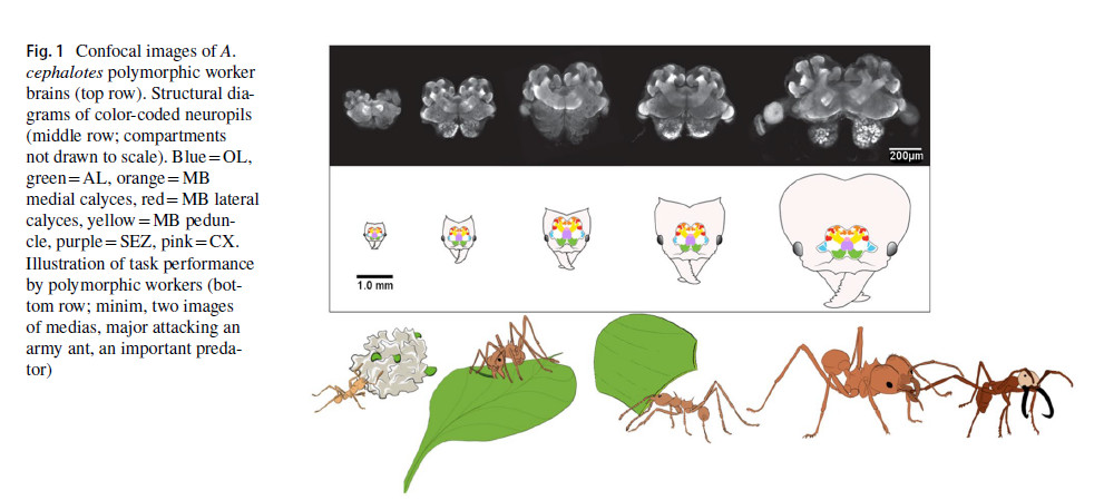 Le cerveau des Atta selon la taille (Muratore et al 2022) :