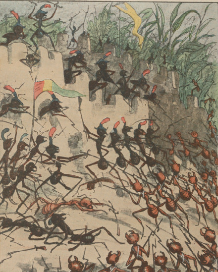La guerre et le rapt des esclaves selon Griset (Chez les fourmis, 1901) :