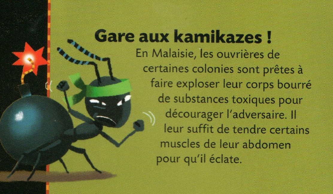 Voir plus sur les kamikazes dans L'Odyssée des fourmis, par Audrey Dussutour et Antoine Wystrach (2022) (p.307).