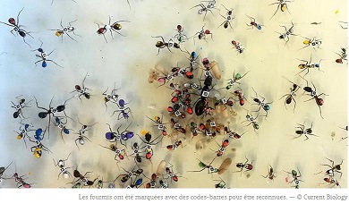 Danielle Mersch au laboratoire de Laurent Keller à Lausanne a marqué des fourmis avec un code-barre de couleurs et les a suivies pendant plus de 40 jours (Mersch et al 2013). Ensuite Nathalie Stroeymeyt dans cette même équipe a marqué individuellement les fourmis de 22 colonies de Lasius niger avec des tags (4266 fourmis marquées)