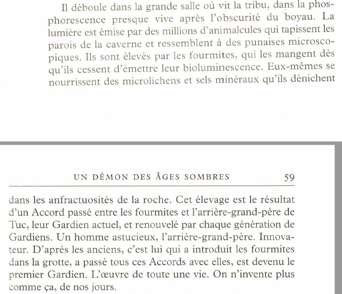 - Dans Semences, Jean-Marc Ligny décrit des fourmites (hybrides fourmis - termites) qui élèvent des des sortes de punaises microscopiques bioluminescentes qu'elles mangent (Pdf1, Pdf2).