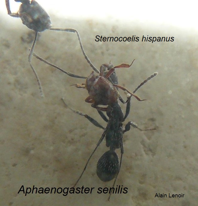 Fourmis toilettées par des myrmécophiles. Nous avons étudié des coléoptères myrmécophiles Sternocoelis hispanus vivant dans les colonies d'Aphaenogaster senilis. Le coléoptère vit très souvent sur les fourmis qu'il lèche, en particulier sur la tête. Il s'occupe aussi beaucoup des larves. Il passe un temps considérable à cette activité de nettoyage de l'hôte. Il est toléré dans la colonie de fourmis car il possède la même odeur coloniale que les fourmis (Lenoir et al 2012).