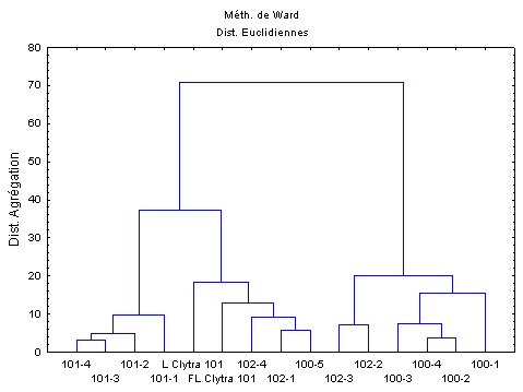 Hydrocarbures cuticulaires des colonies 100, 101, 102, 103 et 104, avec les Clytra