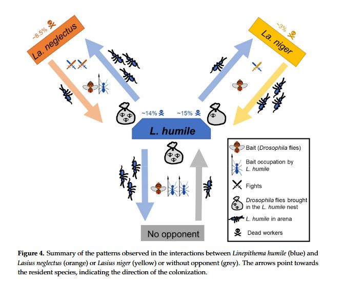 M. Cordonnier a travaillé aussi à Orsay sur la compétition entre la fourmi d'Argentine et les autres espèces de fourmis. Certaines espèces sont-elles capables de lui résister ? Les auteurs ont testé Lasius niger et la nouvelle fourmi invasive Lasius neglectus. L. niger est la seule capable d'inhiber le comportement exploratoire et prédateur de l'Argentine. C'est bon signe, cela limitera sans doute la progression de l'Argentine dans le nord où L. niger est très abondante (Cordonnier et al 2020a).