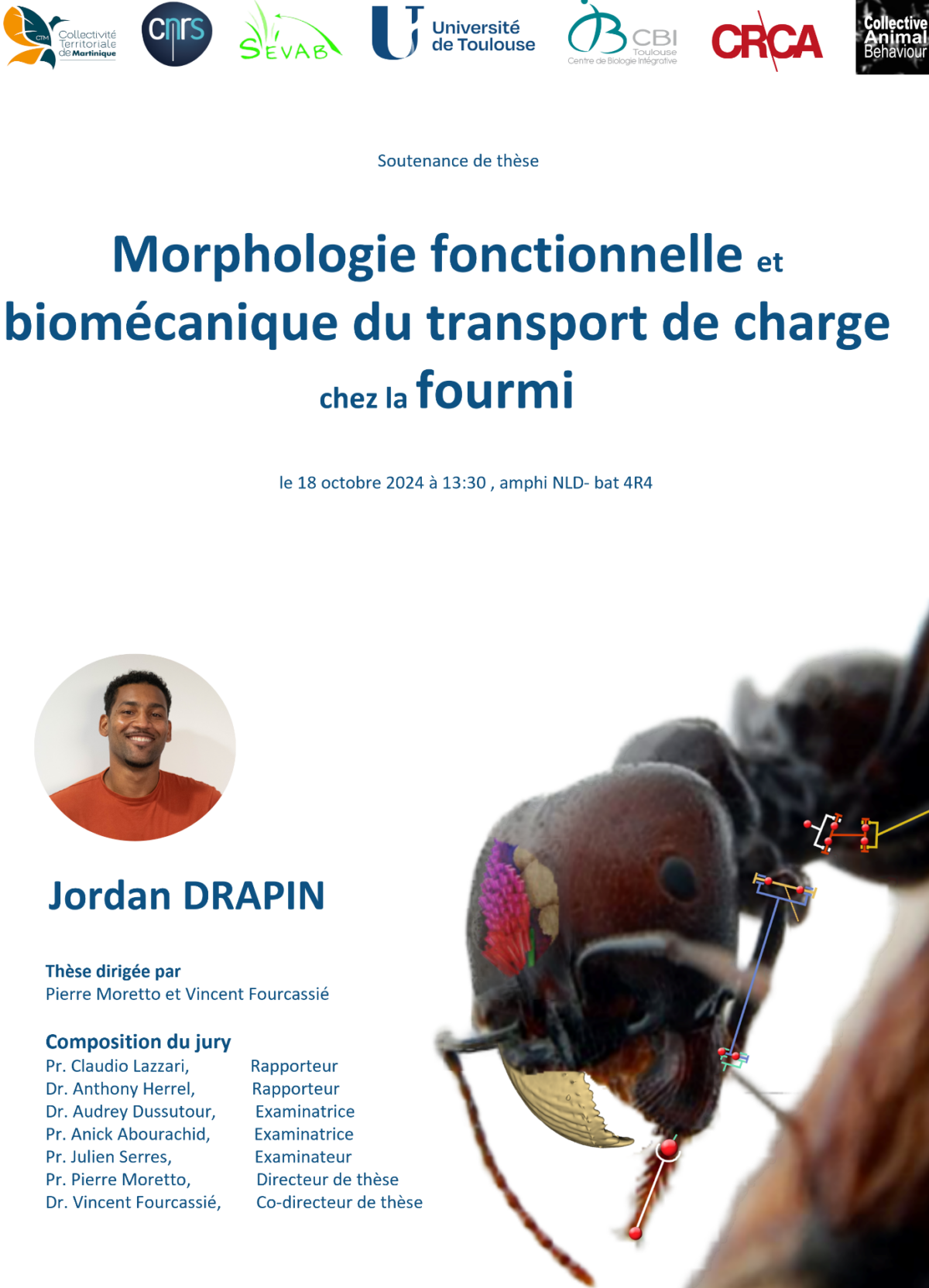 Thèse Jordan Drapin. Morphologie fonctionnelle et biomécanique du transport de charge chez la fourmi. CRCA, Université de Toulouse, 18 octobre 2024. Directeurs de thèse Pierre Moretto et Vincent Fourcassié. Pdf. Thèse sur la fourmi granivore Messor barbarus.