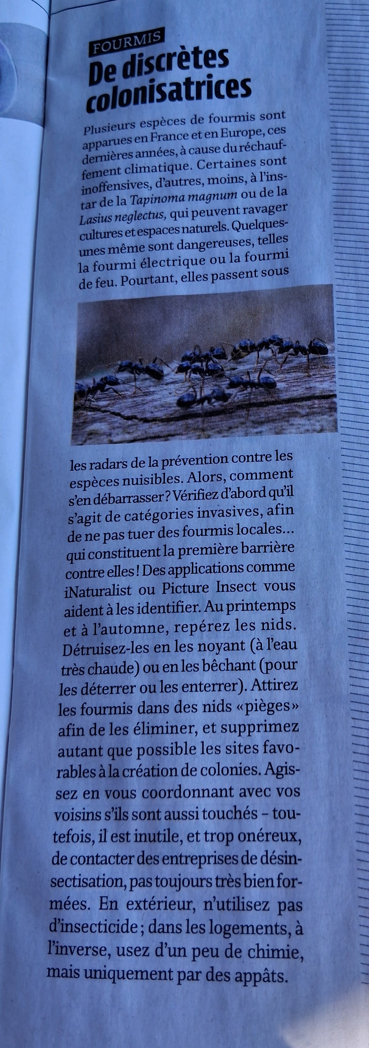 De discrètes colonisatrices. Que Choisir mai 2026. Petit article plutôt bien fait. Il est conseillé de ne pas utiliser d'insecticide en extérieur. Tapinoma magnum ou Lasius neglectus peuvent ravager cultures et espaces naturels. Quelques unes même sont dangereuses, telles la fourmi électrique ou la fourmi de feu. Pdf