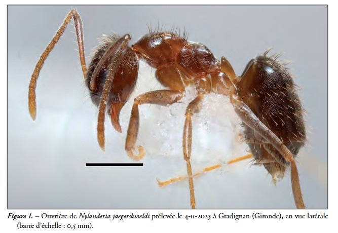 Christophe GALKOWSKI, Première observation en France de Nylanderia jaegerskioeldi (Mayr, 1904) (Hymenoptera Formicidae). L'Entomologiste, 81, 6, 389-392, 2025, ISSN 0013-8886. Des spécimens de Nylanderia jaegerskioeldi (Mayr, 1904), espèce exotique envahissante, ont été observés pour la première fois en France dans la serre chaude d’une jardinerie dans la ville de Gradignan près de Bordeaux. Des individus isolés ont pu être collectés à plus d’un an d’intervalle. Cependant, l’espèce ne semble pas s’être maintenue sur place. Cette espèce est très polygyne, très invasive et se multiplie très rapidement. Elle afrotropicale jusqu'en Afrique du nord. On peut hélas l'acheter sur internet.