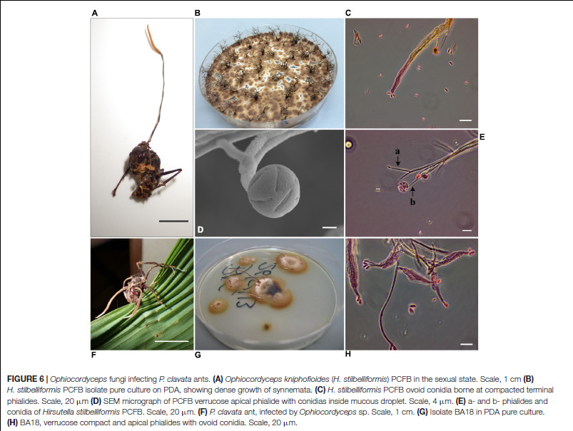Science et Vie Junior de mai 2016 présente un article sur les fourmis parasitées par un champignon qui prend le contôle du système nerveux de son hôte pour qu'il monte sur une branche ou une tige où il va mourir. Le champignon peut alors disperser ses spores en hauteur. Le n° de mai donne l'exemple des fourmis Camponotus parasitées par des Ophiocordyceps en Caroline du Sud (déjà décrit par Wallace dans les années 1850). La Camponotus se laisse tomber de la canopée et reste accrochée sur une feuille par ses mandibules où elle va mourir (comportement déjà décrit par Wallace dans les années 1850). On a montré par génomique que le champignon secrète des protéines et autres métabolites qui vont provoquer une destruction des muscles des mandibules qui restent bloquées fermées. La sphingosine, élément de fonctionnement neuronal est l’une d’entre elles. L’acide guanidinobutyrique s’y trouve aussi (connu pour être responsable d’empoisonnements par des champignons en Chine). Divers gènes, en particulier d'alcaloïdes, sont aussi surexprimés. Le champignon peut aussi infecter et tuer d'autres fourmis mais ne sait pas manipuler leur comportement (Anonyme 2011; Charissa de Bekker et al. 2014, 2015, au laboratoire de David Hughes, Hugues et al 2014, Pennisi 2014). Matarrita-Carranza et al (2017) ont identifié 4 espèces chez des hyménoptères et en particulier chez Ponera clavata.