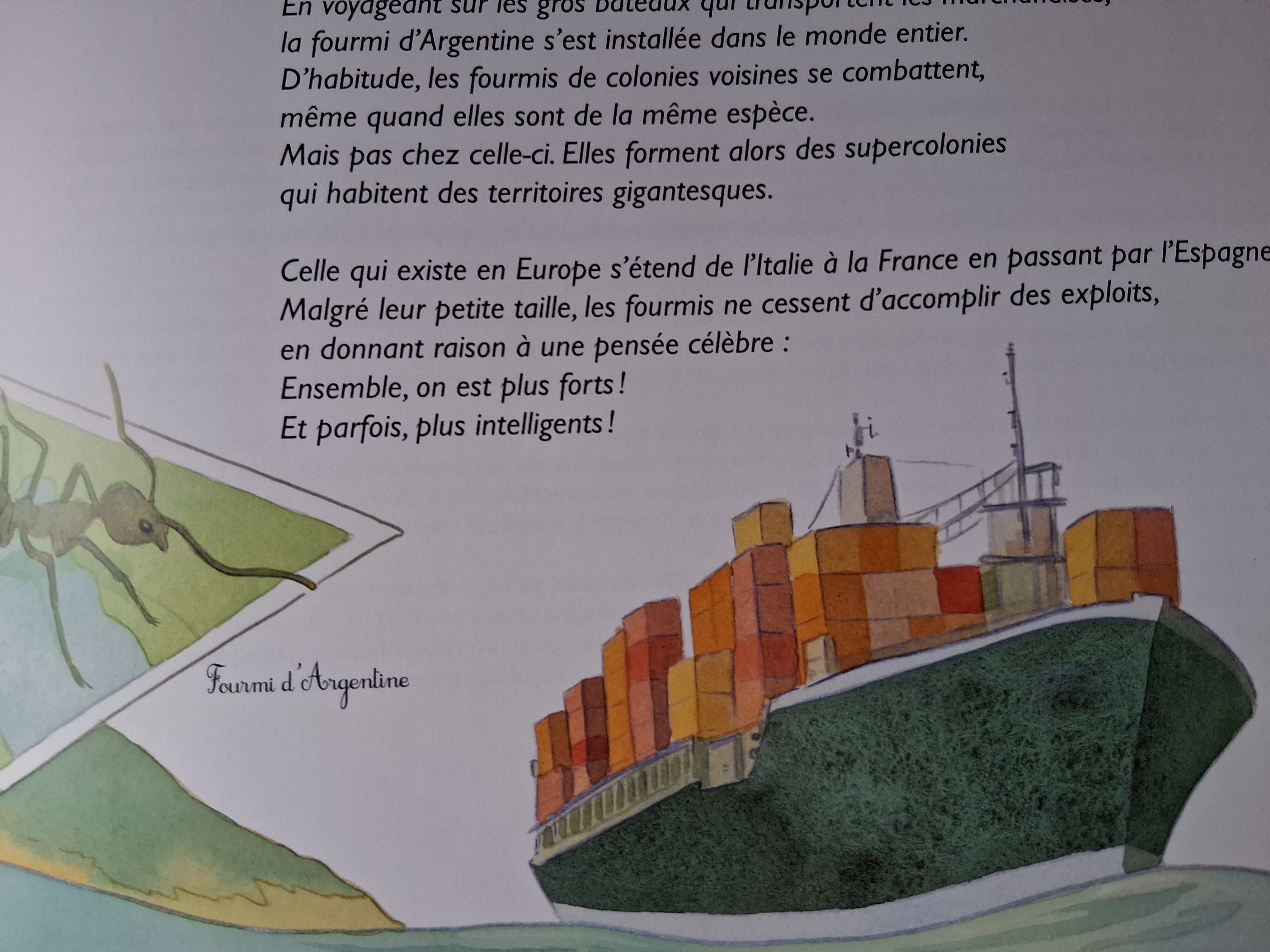 Dans L'Odyssée des fourmis, Audrey Dussutour raconte l'invason de leur labo à Toulouse par cette espèce (p.368) et dans À quoi pensent les abeilles ? de Mathieu Lihoreau : la super-colonie de fourmis d'Argentine (p.63) et les méfaits de cette fourmi sur des colonies de bourdons dans le laboratoire de Toulouse (p.126). "Toutes ces populations invasives ont perdu leur capacité de reconnaisance coloniale. C'est peut-être d'ailleurs la clef de ces invasions à succès."