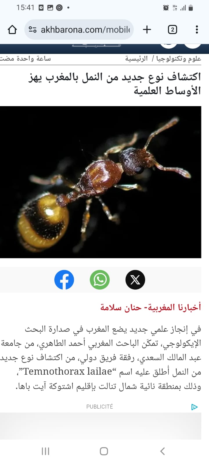 Voir vabiladi : Découverte de la nouvelle espèce de fourmis Temnothorax lailae à Chtouka Aït Baha, par Latifa Babas, 1er déc 2025.