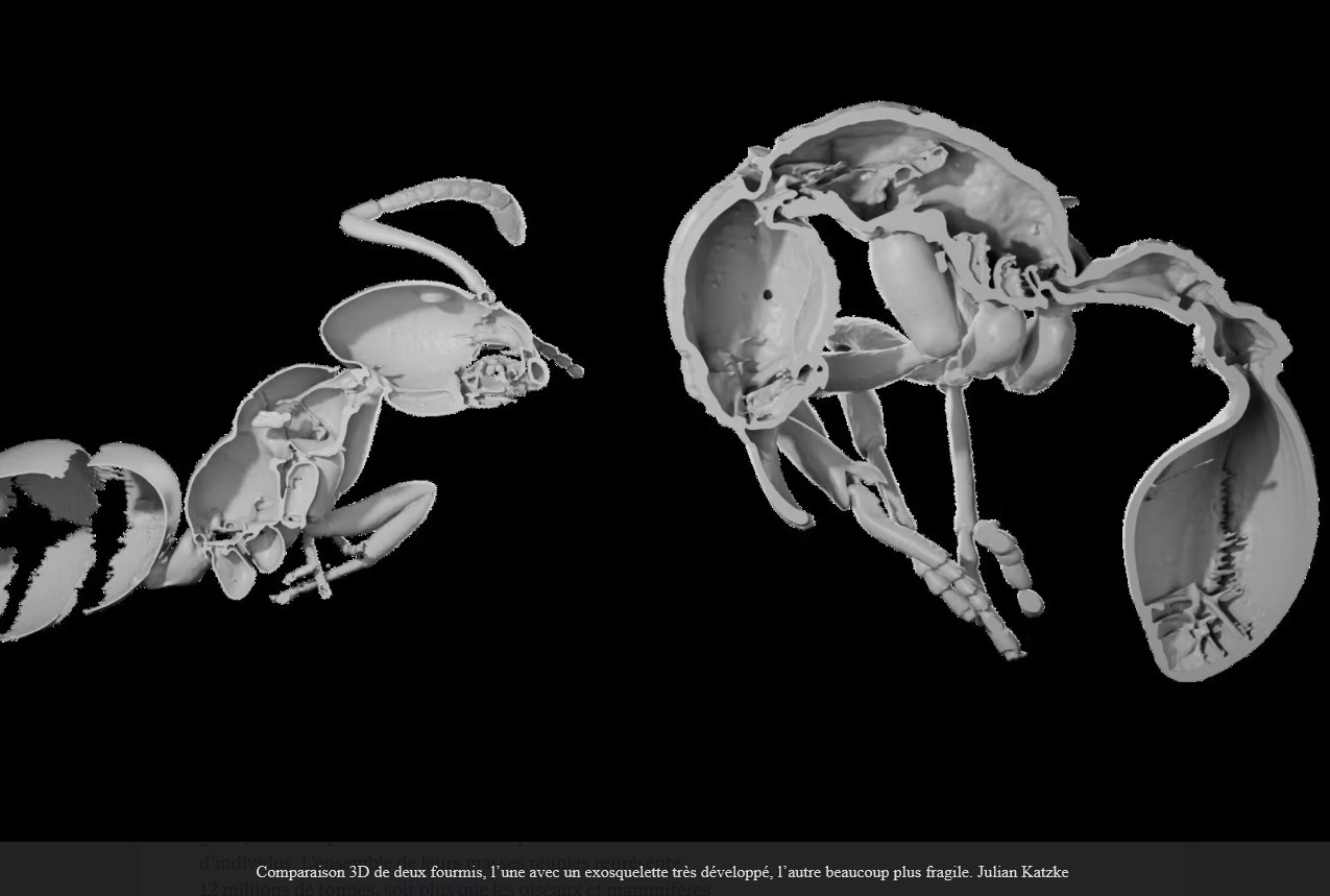 Publication sur la taille des fourmis en relation avec leur cuticule et leur aptitude à coloniser la terre. Article dédié à Christian Peeters (2017) pour ses travaux précurseurs. 880 spécimens de 507 espèces de fourmis scannés en 3D x-ray. Voir Cuticule