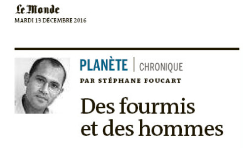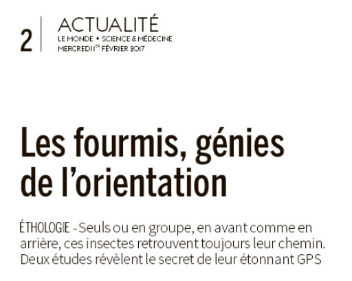 Les fourmis, génies de l'orientation. Le Monde Science & Médecine 1er février 2017. Cet article présente deux publications sur le retour au nid de fourmis avec des proies. Il s'agit de Nylanderia fulva, la fourmi folle d'Australie (Fonio et al 2016) et l'article compare ces données avec celles d'Antoine Wystrach sur Cataglyphis (voir plus bas). Il y a une interview de Thibaud Monin.