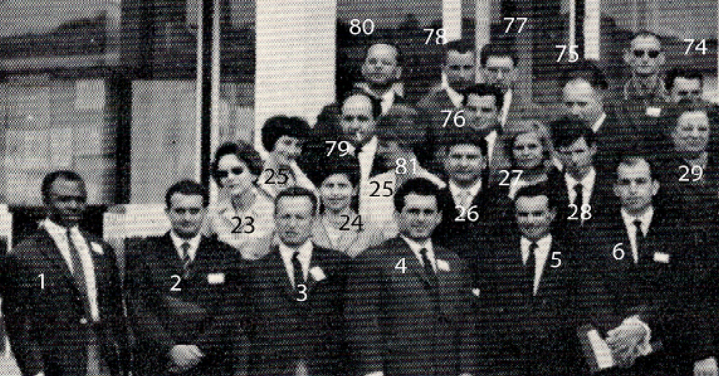 Quelques personnes identifiées : Pierre-Paul Grassé n'est pas sur la photo, Luc Passera (2), Jacques Gervet (3), Howse (8?), André Ledoux (11), Jean-Robert Denis (12) merci Gilbert Chauvel, Rémy Chauvin (14), Martin Lindauer (18?), Jean Deligne (43), Jacques Pasteels (44), Albert Bouillon (45), Mme Noirot (47), Mathis Maurice (49), Albert Vandel (50), Jean Soulié (51), William Sands (60), Danièle Dargagnon (66), Jean Lévieux (74?), Georges Le Masne (77), Pierre Cassier (79). Si vous reconnaissez quelques personnes ou voyez des erreurs, me donner les informations (Mail Alain Lenoir)